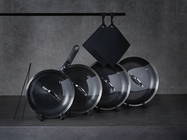 Det som verkligen skiljer våra produkter från vanliga grytor och stekpannor är den unika laseretsningsprocessen som skapar det patenterade ONYX COOKWARE™ hexagonala designen. Denna unika process skapar en serie av toppar och dalar på köksutrustningen. I dalen finns det non-stick material som ser till att du får den non-stick funktionaliteten och enkel rengöring. En av topparna är rostfritt stål som ger hållbarhet, perfekt stekning av ditt kött och möjligheten att använda metallredskap. Det är därför vi kallar våra grytor och stekpannor "hybrid". De ger dig det bästa av två världar; Den non-stick funktionalitet som vi alla vill ha i våra köksredskap och hållbarheten hos en professionell rostfri stål- eller gjutjärnspanna.