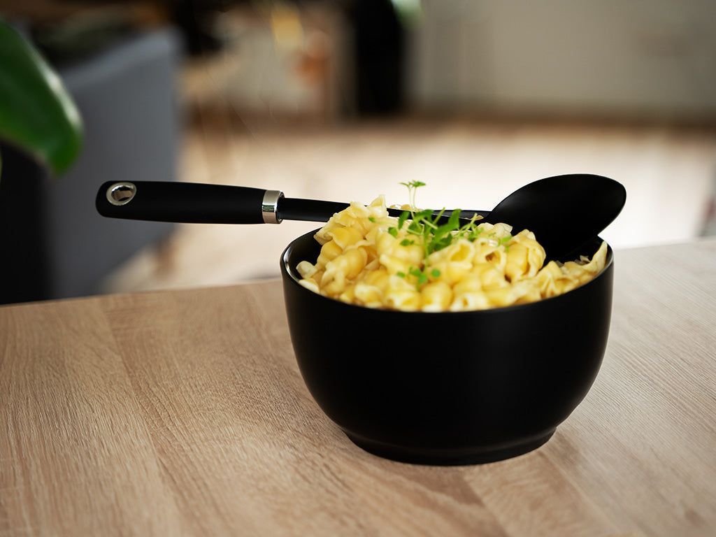 Skeden ONYX COOKWARE™ FAST SKED är det nya vardagsverktyget för ditt kök! Dess kvalitetsstål med släta svarta titandetaljer är verkligen unikt. Det eleganta utseendet är inte bara för syns skull. Den här stadiga pastasleven är extremt slittålig och klarar din matlagning i många år framöver.