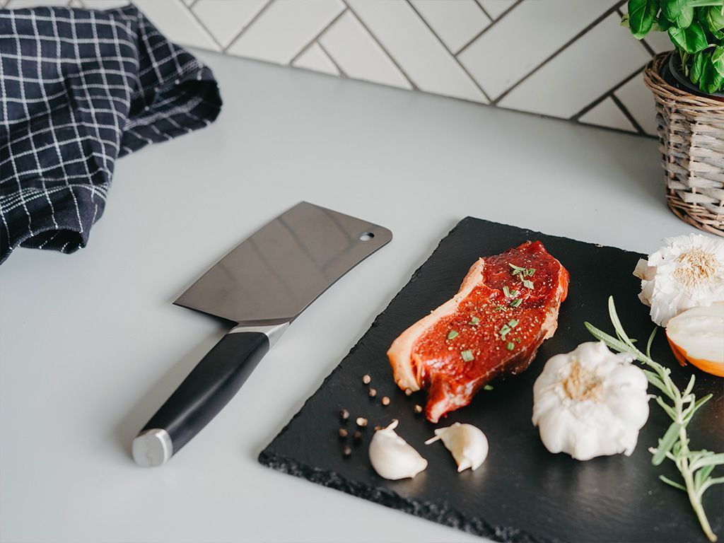 ONYX COOKWARE™ KÖTTYXA är utformad för komfort och enkel manövrerbarhet med sitt ergonomiska handtag, vilket innebär att du kan hacka grönsaker och kött i timmar utan obehag!