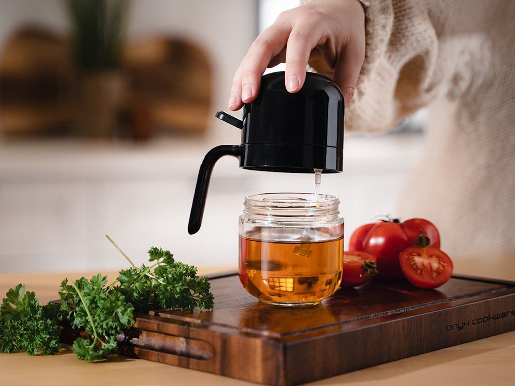 ONYX COOKWARE™ OLJESPRAY – 300ML är byggd för mångsidighet och enkel användning. Dess lätta och ergonomiska design gör den perfekt för hemmakockar och matentusiaster likväl. Från matlagning och bakning till att lätt klä sallader, denna oljespruta är din allt-i-ett kökslösning.