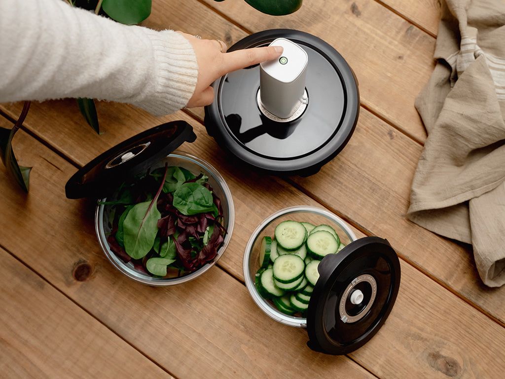 Vakuumbehållaren bevarar din mat upp till fem gånger så länge. Använd vakuumpumpen för att skapa ett vakuum, så har du på några sekunder vakuumförpackad mat redo att användas när du behöver den. Den smarta designen gör det möjligt att stapla behållarna ovanpå varandra, vilket skapar mer utrymme i kylen för dina andra matvaror. Och på toppen av locket finns en manuell dag- och datumklocka så att du enkelt kan se hur länge maten har varit vakuumförpackad.