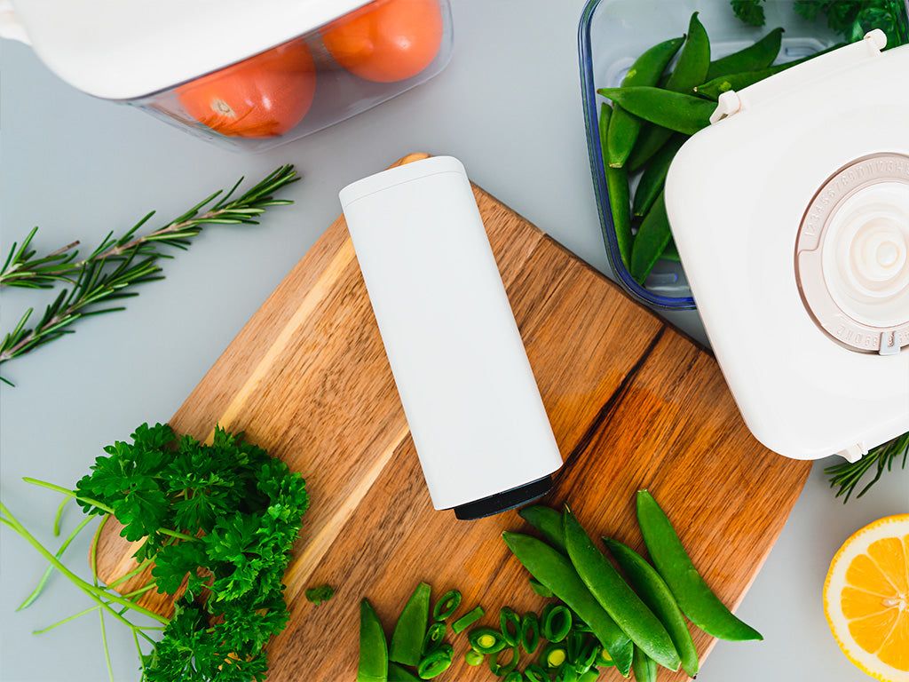 Vi har tagit din vanliga matbehållare och lagt till en vakuumventil på den. Sedan har vi designat en liten och praktisk batteridriven vakuumpump som passar precis till ventilen. tack vare den mindre storleken, och (enligt vårt tycke) snygga designen, får den enkelt plats på din kryddhylla eller annan lättillgänglig plats.