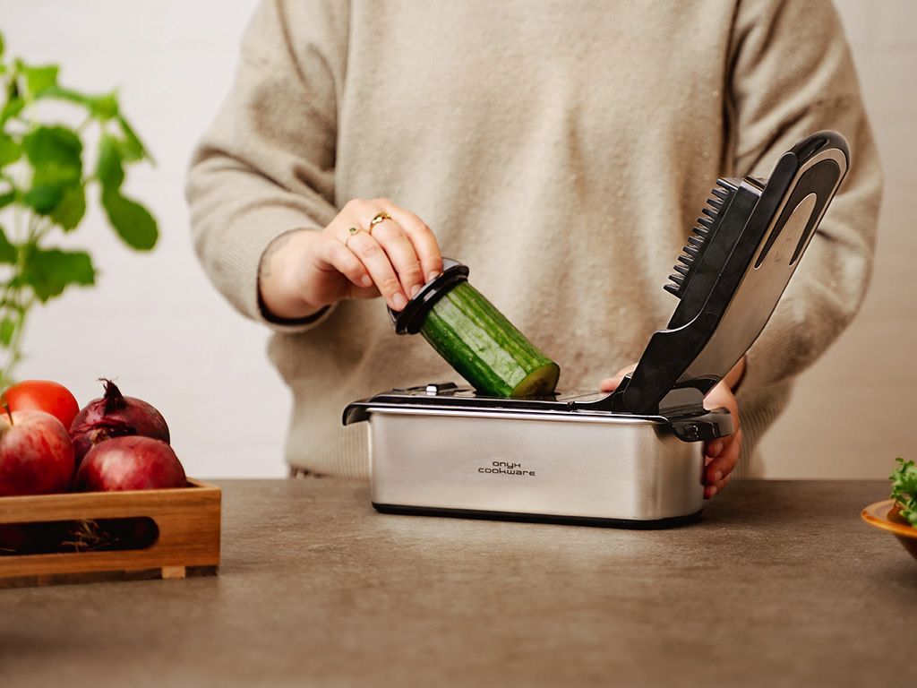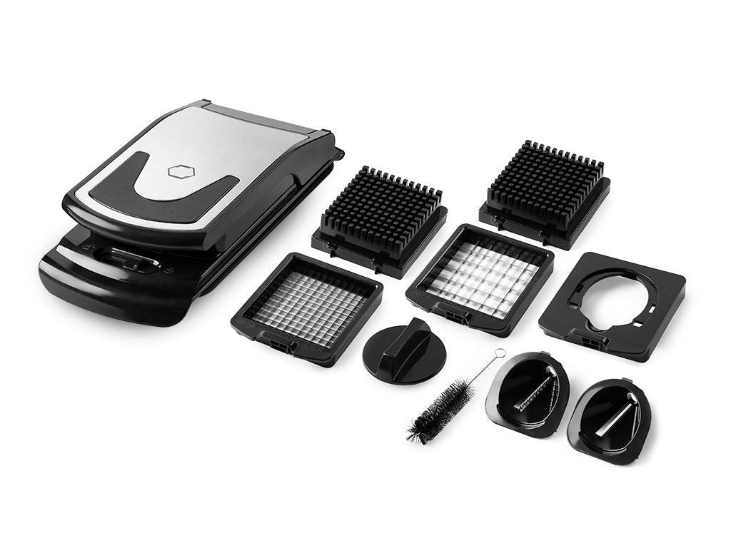 Tillverkad i 100 % rostfritt stål kombinerar denna hackare hållbarhet med en modern, elegant design. Den säkra låsmekanismen håller bladen på plats under användning och ger trygghet. När du är klar är rengöringen enkel tack vare diskmaskinssäkra delar. Oavsett om du skivar, hackar eller spiraliserar förenklar detta allt-i-ett-verktyg din matförberedelse och sparar både tid och energi.